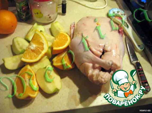 3. Положить четвертинки апельсина и четвертинки одного яблока внутрь тушки вместе с несколькими веточками укропа и небольшим кусочком очищенного имбиря.