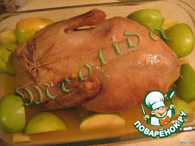 8. В форму для выпекания (размером 1/2 противня) положить кусочки имбиря, яблочки, вылить вино. В центр поместить утку.