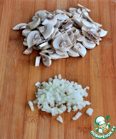 Шампиньоны помыть, обсушить. Лук репчатый очистить, помыть, мелко нарезать. Обжарить на оливковом масле сначала лук до золотистости, раздавить зубчик чеснока. Добавить грибы, обжаривать грибы, пока не уйдет лишняя влага. Чеснок выбросить.