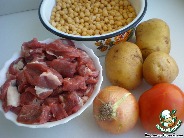 Горох нут залить водой на 5-6 часов. Потереть его руками, чтобы отшелушить тонкую оболочку. Нут при варке не разваривается, в отличие от простого гороха. Мясо нарезать на небольшие кусочки, ребрышки порубить.