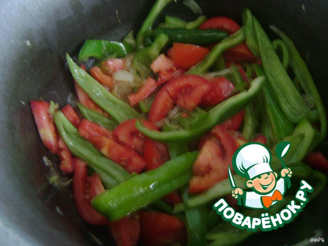 В раскаленном масле обжарить лук до золотистого цвета.Болгарский перец нарезать широкими полосками, добавить к луку.Острый перец можно положить целиком.