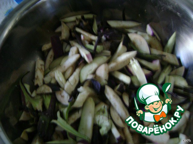Баклажаны нарезать брусочками.Посолить и оставить на некоторое время.