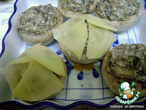 Начинку выложить в шляпки, накрыть кусочками сыра и поставить запекаться в сильно разогретую духовку.
