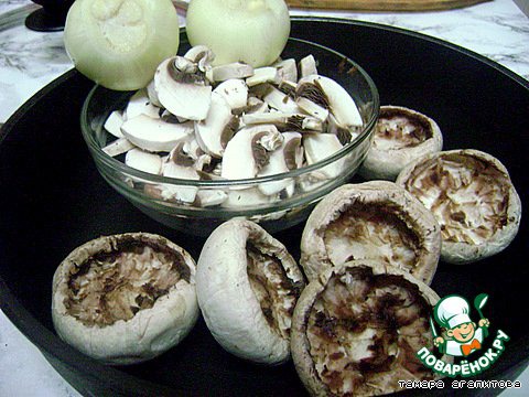 Шампиньоны почистить от внутренних перепонок, отрезать ножки и нарезать их.