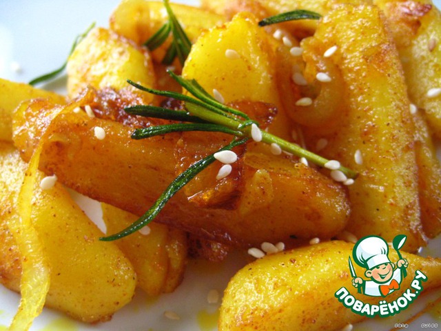 Через 10 мин. добавляем карри, куркуму, имбирь, паприку, розмарин и жарим до готовности картофеля.