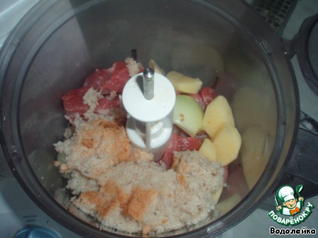 Итак, первым делом делаем фарш. Измельчаем в блендере (или через мясорубку) мясо, очищенный картофель, лук, размоченный кусок хлеба (сколько именно нужно хлеба не могу сказать, я всегда кладу на "глаз"), чеснок.