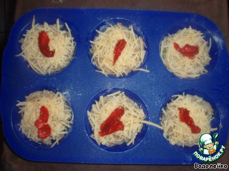 Берем формочки, смазываем их маслом, притрушиваем сухарями и до половины заполняем мясным фаршем, сверху положить немного натертого сыра и по оливке (у меня оливок не оказалось, поэтому я положила вяленые помидоры).