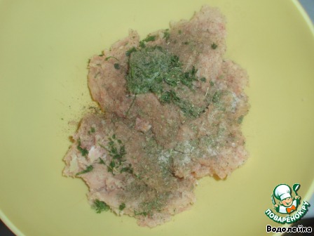 После добавляем в фарш измельченную зелень, соль, перец и специи по вашему вкусу.