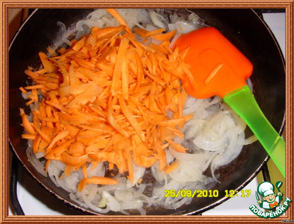 Лук и морковь обжарить до прозрачности, добавить курицу и обжаривать еще пару минут.
