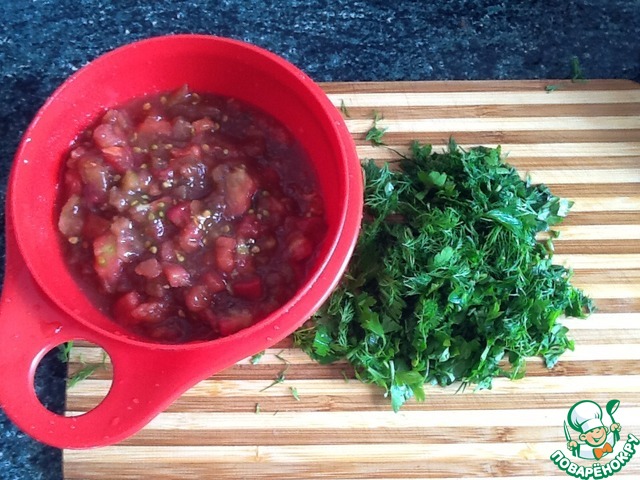 Смешиваем нарезанные помидоры и зелень. Сливаем с помидор образовавшийся сок.