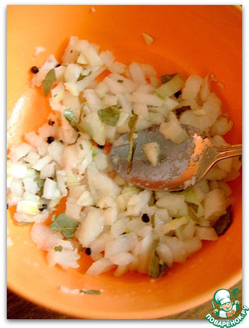 Делаем смесь для маринада: мелко нарезаем 1 луковицу, добавляем соль, тертый чеснок, поломанный лавровый лист, перец горошком и все это перемешиваем.