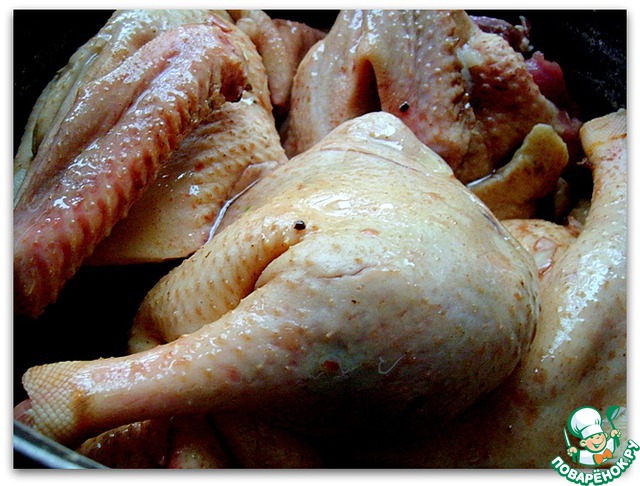 Тщательно обмазываем этой смесью куски утки, помещаем их в посуду с крышкой и убираем в холод на 2 суток.