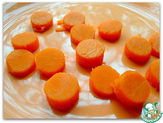 Морковь притушиваем в небольшом количестве кипящей воды около 5 минут и нарежем ее дисками.