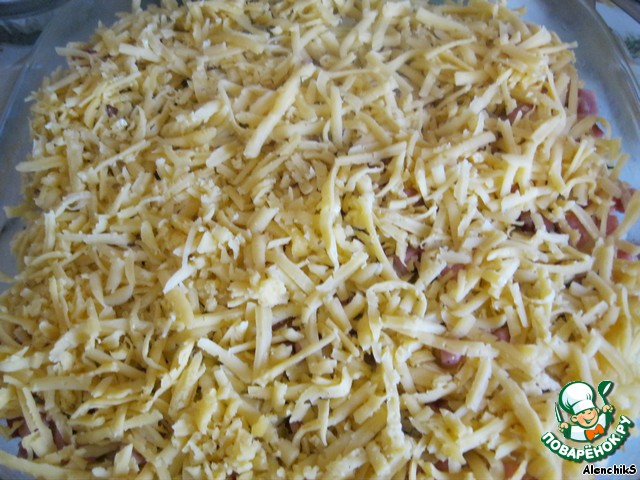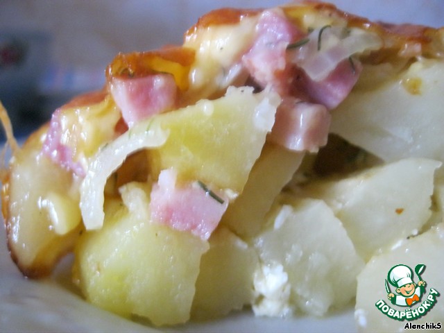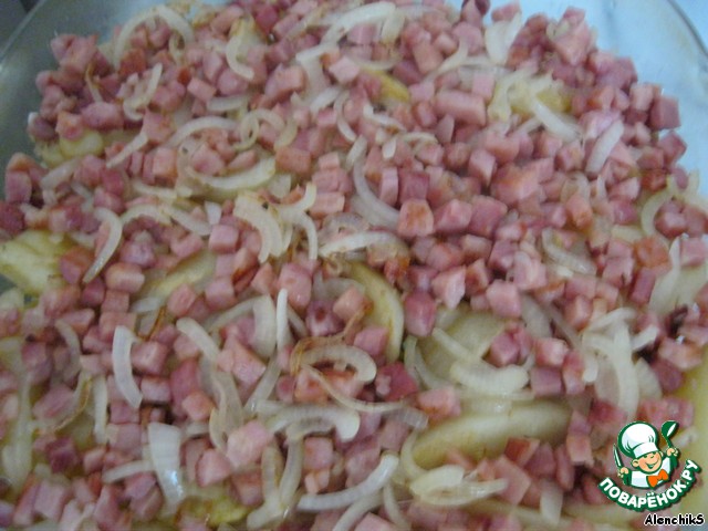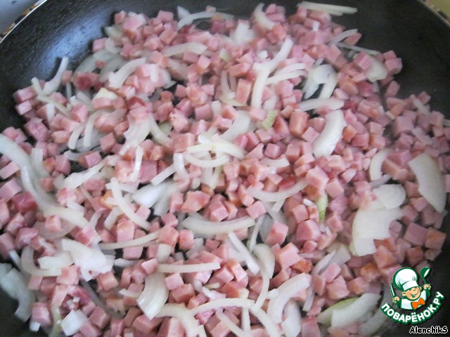 Лук нарезать полукольцами, ветчину мелким кубиком. Обжарить вместе до мягкости лука.