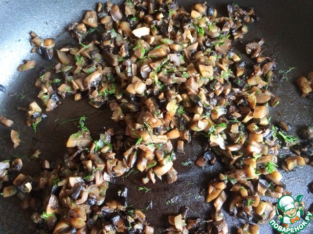 Мелко порезанные шампиньоны обжарить с репчатым луком и зеленью, чтобы испарилась вся лишняя жидкость из грибов. Посолить можно соевым соусом.