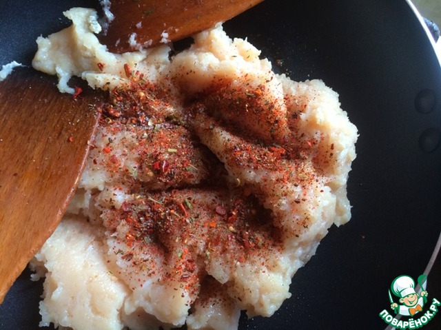 Вот наша картофельная мякоть. Разомните ее толкушкой. Я ее еще слегка обжарила на маленьком кусочке сливочного масла (минуты 2-3), но это не обязательно.