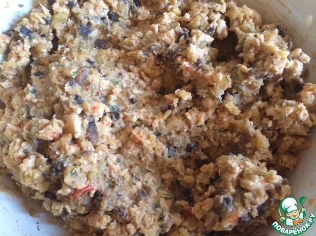 Смешать в миске картофельную мякоть, грибы и фарш. Посолите-поперчите по вкусу. Добавить ваш любимый соус (примерно 2-3 столовые ложки), или, к примеру, сметану, сливки... У меня был соус паприк.