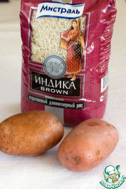 Для необычной оболочки наших пирожков нам потребуется длиннозернистый рис и картофель. Можно использовать, как белый, так и коричневый сорта риса.