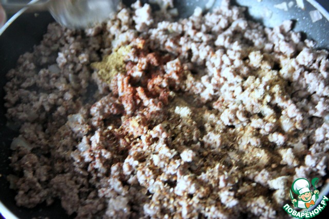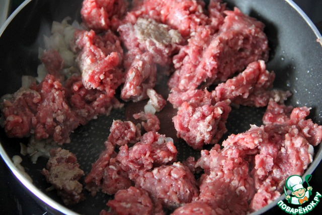Добавить говяжий фарш и жарить ок. 5 мин., помешивая.
