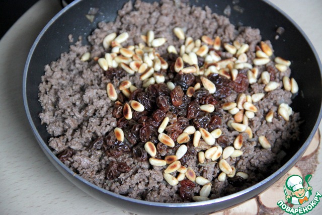 Для начинки: на сухой сковороде без жира поджарить орешки пинии (или кедровые). Поджаренные орешки отложить в сторону, остывать в тарелке.