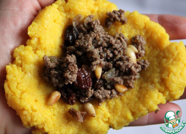 На влажную ладонь выложить часть теста, превратить в лепёшку и вложить внутрь 1 ст. л. подготовленной мясной начинки.