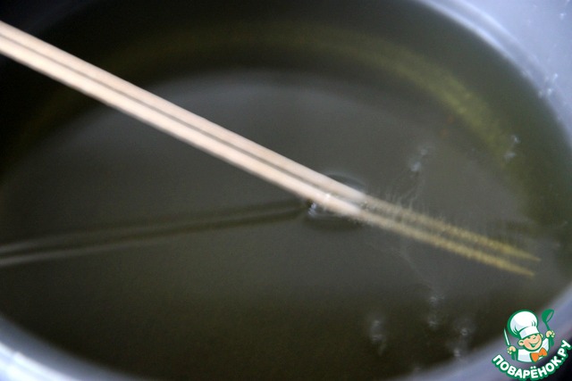 Масло следует подогревать до температуры 180*С. Проверяется с помощью деревянной лучины: если вокруг палочки возникают пузырьки, то масло подогрето до нужной нам температуры.