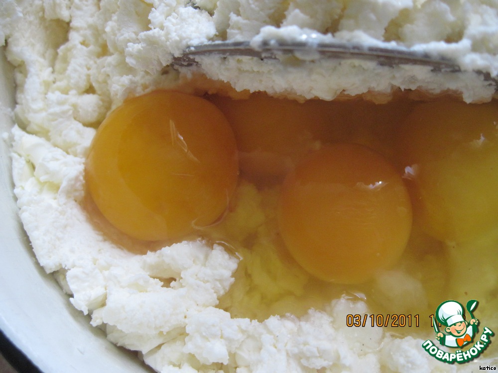 Размять творог с сахаром, если творог нежирный, добавьте 100 г сливочного масла,