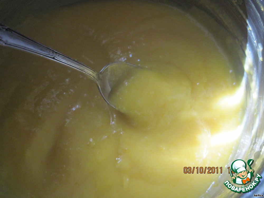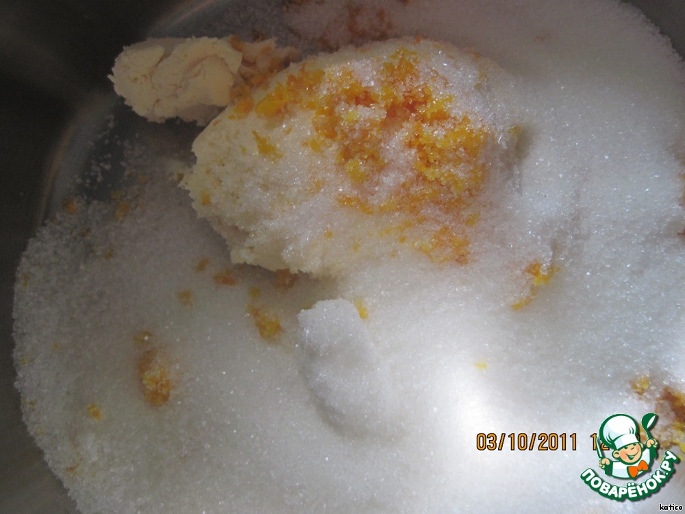 полторы столовые ложки мягкого сливочного масла (около 100 г) смешать с сахаром, цедрой, яйцами.