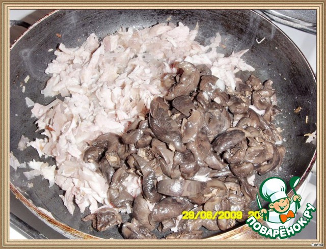 и отварные грибы,все хорошенько потомить в небольшом количестве растительном масле.Посолить, поперчить..