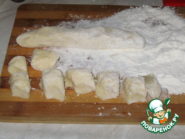 Из полученной массы сформировать колбаски, которые затем порезать на кусочки и отварить в воде.