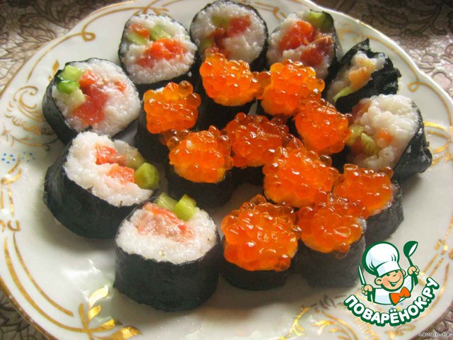 На слой пергаментной бумаги ( или специальный коврик) кладем лист нори так, чтобы его можно было свернуть потом от себя. Выкладываем на лист рис слоем в 1 см, смачивая руки в холодной воде с уксусом. Рис должен занимать 2/3 листа. Берем за край пергаментную бумагу и начинаем сворачивать ее вместе с нори в рулет. Затем аккуратно отлепляем нори и катаем тугой длинный рулетик. Острым ножом нарезаем из рулета брусочки (роллы), на каждый ролл выкладываем сверху красную икру.