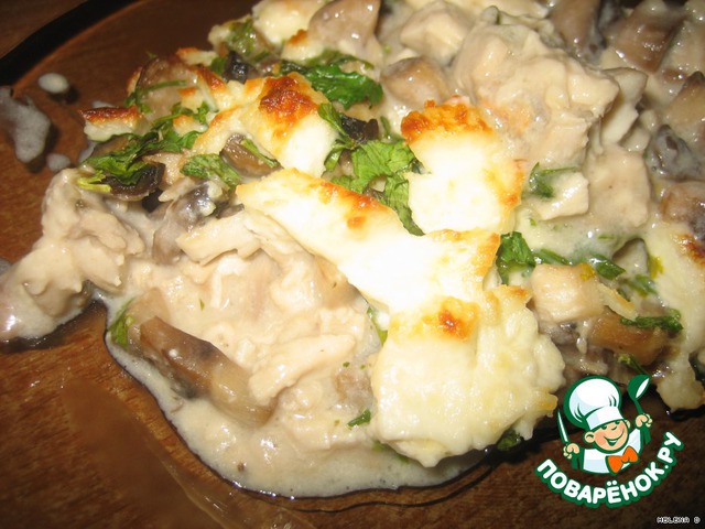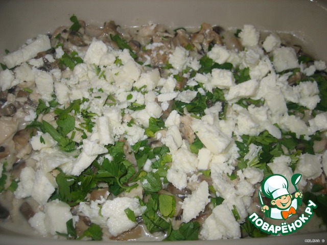 сливки соединяем с приправой, зеленью и заливаем курицу с грибами,