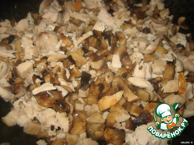 Соединяем и обжариваем измельченные курицу и грибы минут 10...
