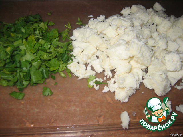 Измельчаем сыр (у меня был мой любимый адыгейский) и зелень