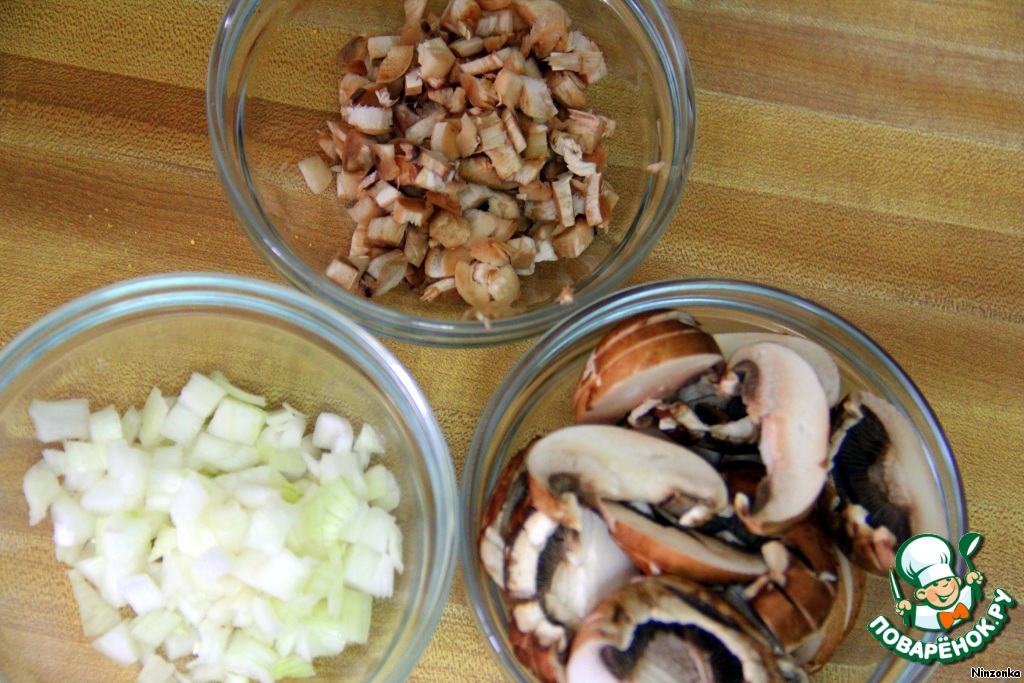 Лук и ножки грибов мелко нарезаем. Шляпки грибов нарезаем вдоль на кусочки.