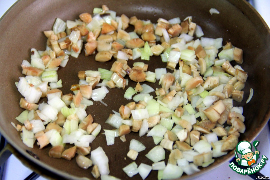 На сковороде сначала обжариваем лук и ножки грибов. И откладываем в сторону.