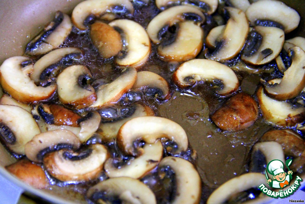 На этой же сковороде обжариваем шляпки грибов до готовности. Около 5 минут. И тоже откладываем в сторону.
