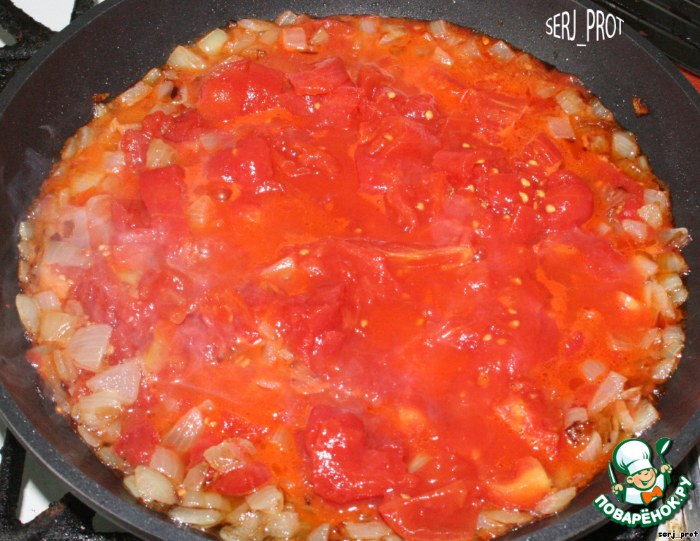 Снимаем кожицу с помидор, крупно нарезаем и добавляем вместе с соком в зажаренный лук.