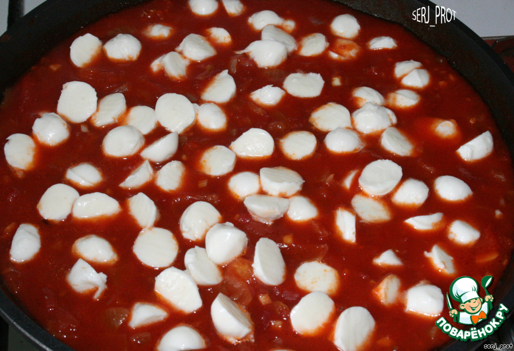 Шарики моцареллы разделить, выложить в соус и, помешивая, растворить в соусе