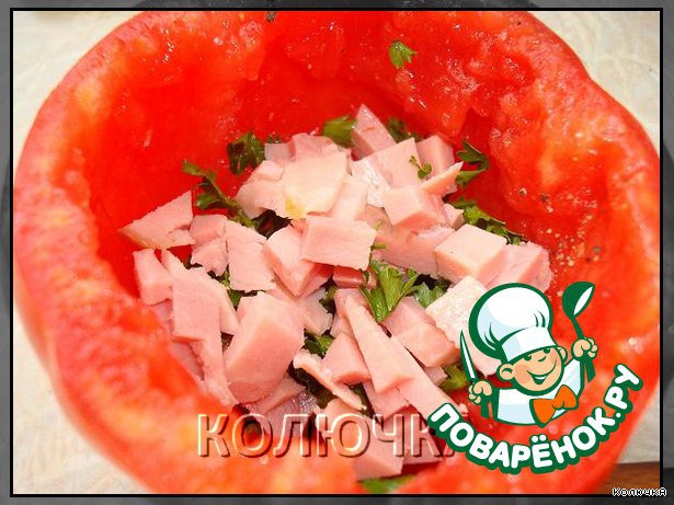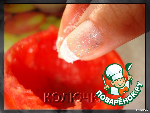 Итак, когда я поняла,что готовить нужно только для себя любимой, естественно все приготовила на 1 порцию. Берем большой помидор и срезаем шляпку,вынимаем серединку. Ее я не выбрасывала,завтра она вполне пойдет в соус для спагетти)
