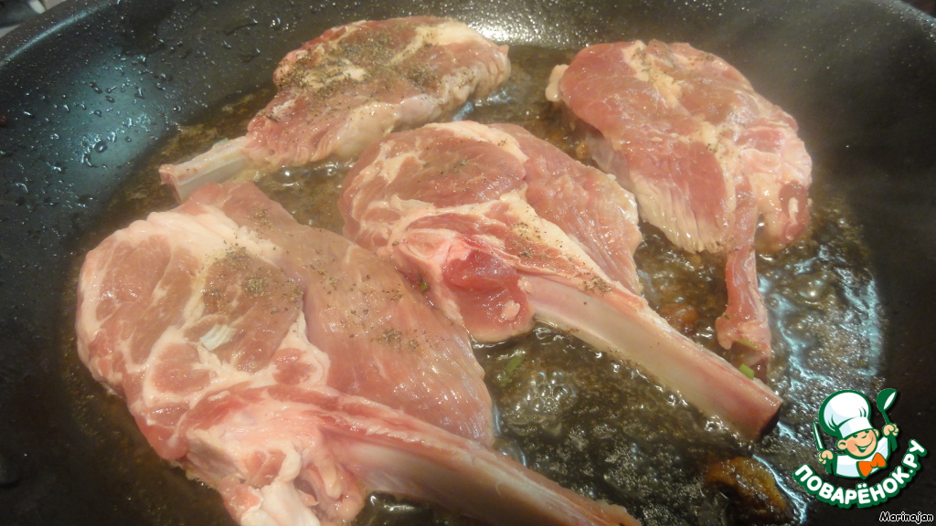С мяса срезаем жир и прокаливаем его на горячей сковородке и начинаем поочередно жарить.