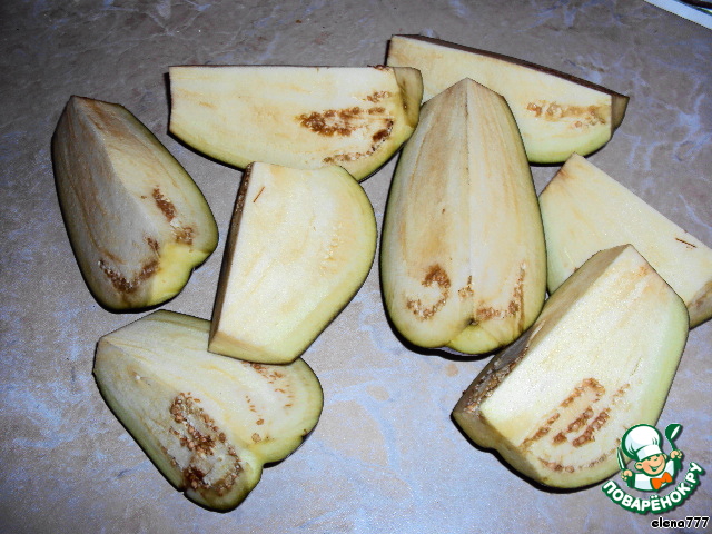 Нам понадобятся вот такие продукты. Баклажаны лучше взять небольшие вытянутые. У меня были большие и почти круглые, поэтому я взяла 2 шт., но пришлось разрезать каждый на 4 части.