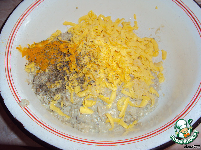 В баклажаново-творожную массу добавить тёртый сыр (сыр можно взять любой другой мягкий, сливочный из коровьего молока), специи, тёртый чеснок, 1ст.л молотых грецких орехов, посолить, поперчить, перемешать.