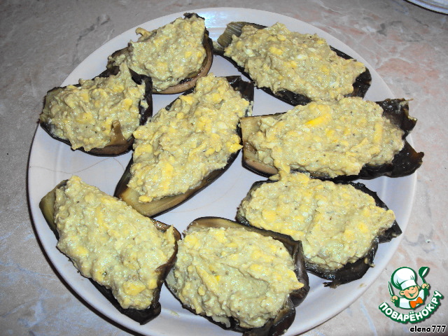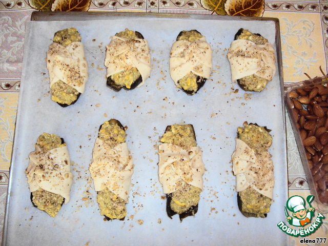 Выложить баклажаны на противень, застеленный бумагой для выпечки, смазать верх желтком и обсыпать молотым миндалём или грецкими орехами.
