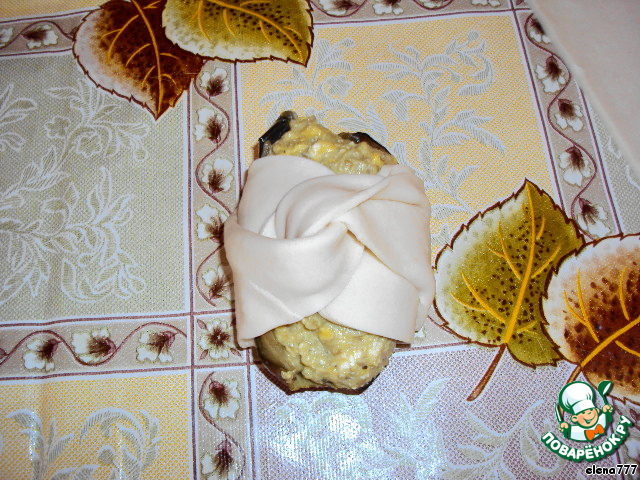 Завернуть баклажаны в тесто, делая узелок. Вот так.