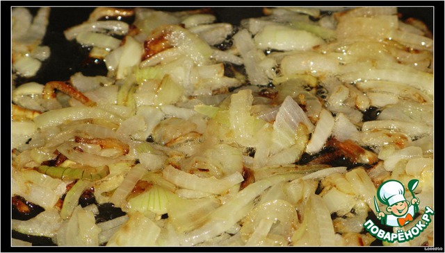 Режем репчатый лук и обжариваем до золотистого цвета.