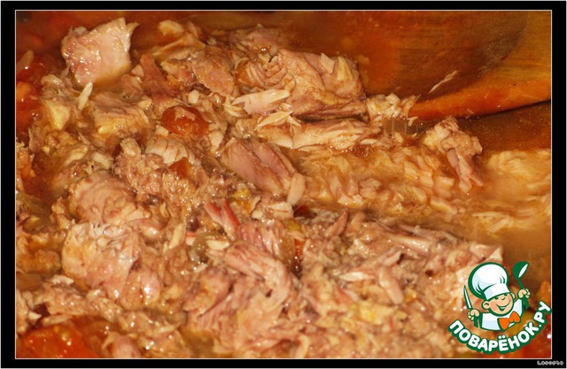 К овощной смеси добавить тунца и влить сок, перемешать, добавить базилик, черный молотый перец и посолить.