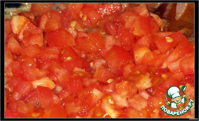 Помидор обдать кипятком, снять кожицу, порезать кубиками и добавить к жареному луку.