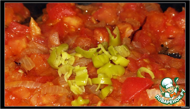 Острый перчик нарезать маленькими кусочками и добавить к томатно-луковой смеси, тушить около 5-10 минут.