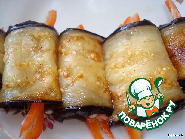 С баклажанов салфеткой убираем лишний жир. Кладем буквально капельку майонеза, немножко чеснока и тонкую полосочку перчика и заворачиваем.